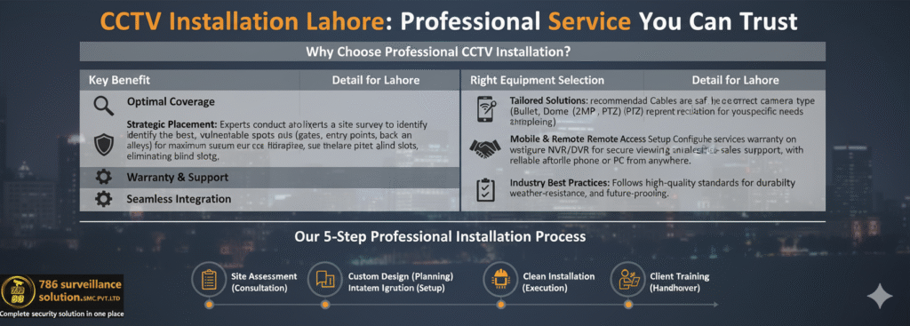 For residents and businesses in Lahore, 786 Surveillance Solution PVT LTD provides Top-rated CCTV Installation and Services. We handle everything—from setup to system testing—so your security cameras in Lahore are always reliable.